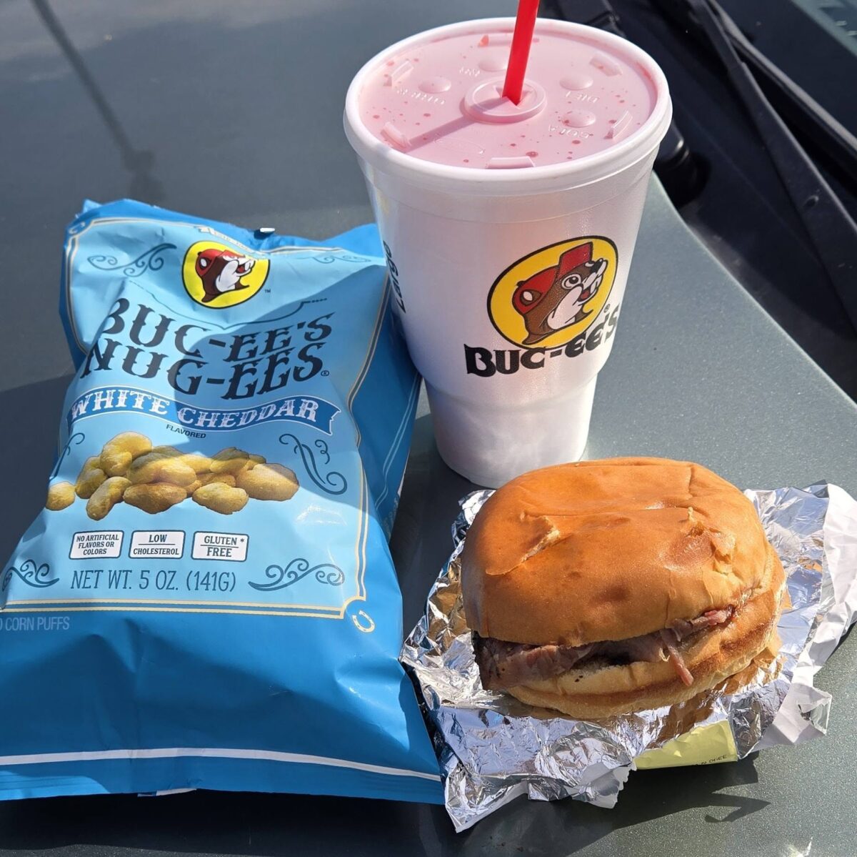 My favorite lunch at Buc-ees: Brisket, Big Red, and Beaver Nuggets.