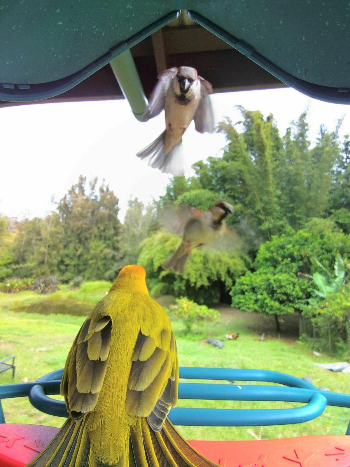 The Bird Buddy at Aloha Acres gets crowded. I believe these birds are a Java Sparrow and Saffron Finches.