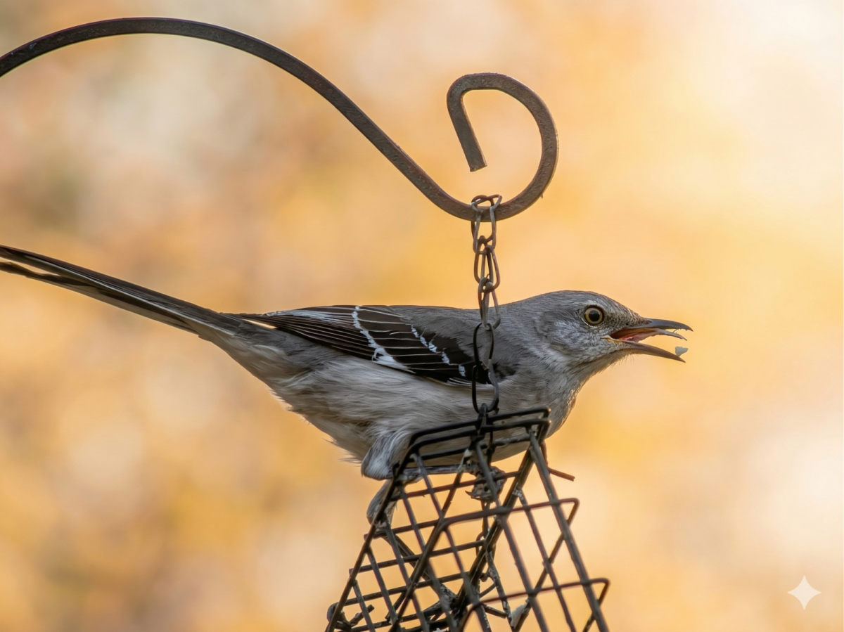 In this shot, it actually looks like the bird has a small piece of suet or a seed right on the tip of its tongue! Mockingbirds have slightly frayed, “brush-like” tips on their tongues that help them nectar-feed or manipulate small bits of food. It also just happens to be a perfect “blep” moment for the camera.