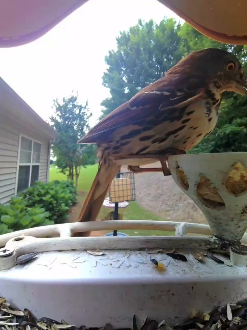 The Brown Thrasher that’s been hanging around in my yard finally made an appearance at my Bird Buddy.