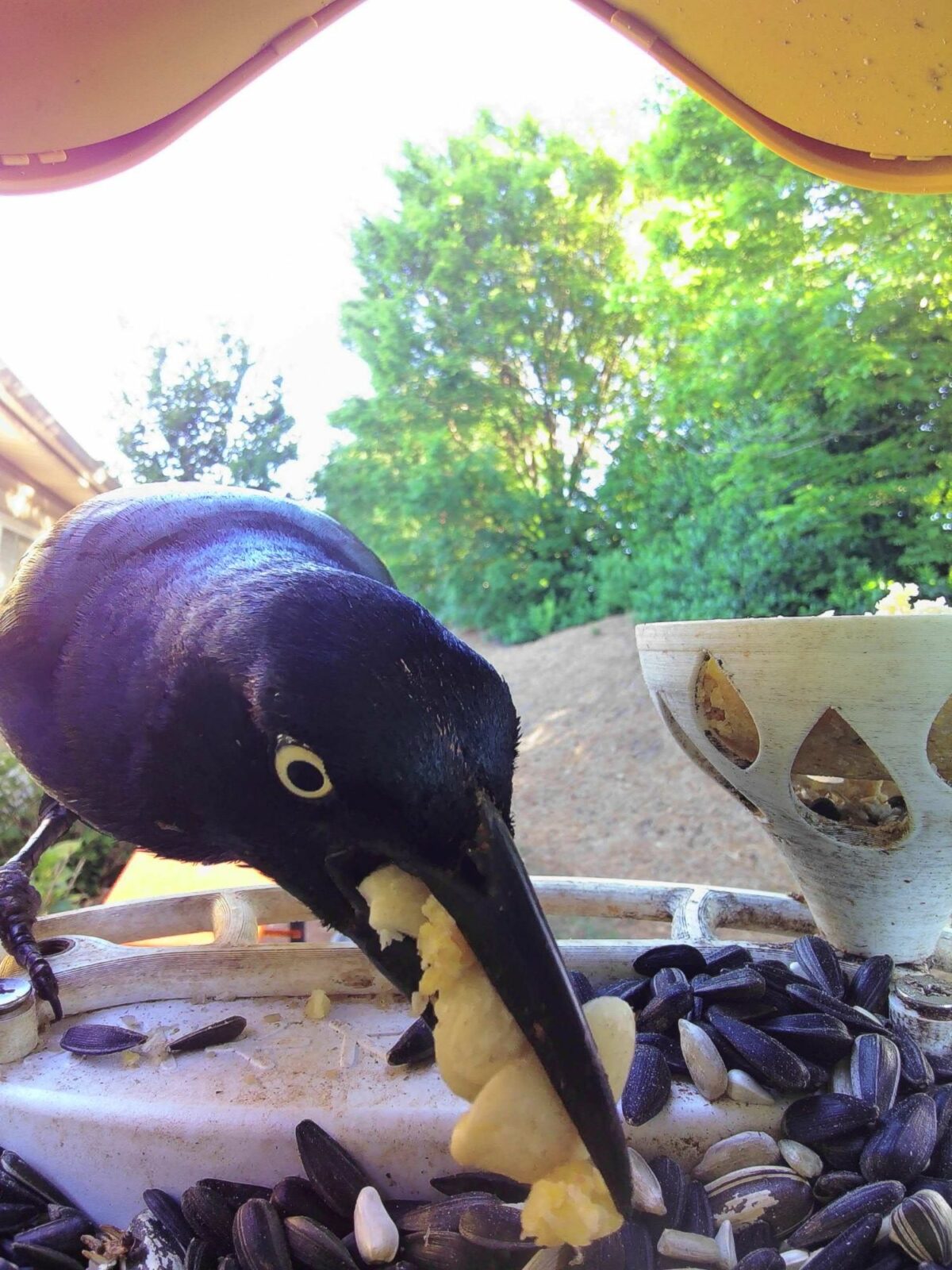 Gotta admire this Grackle’s hustle! How does he fit it all in his beak? #birdBuddy