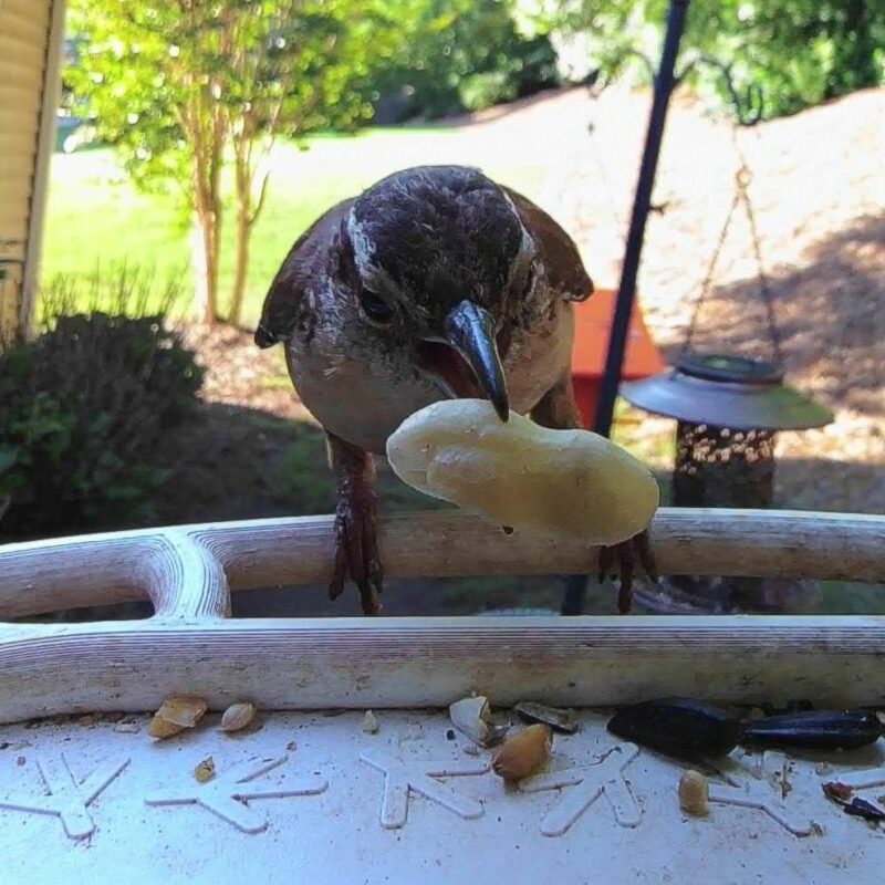 That 🥜 is almost as large as that Carolina Wren’s head!